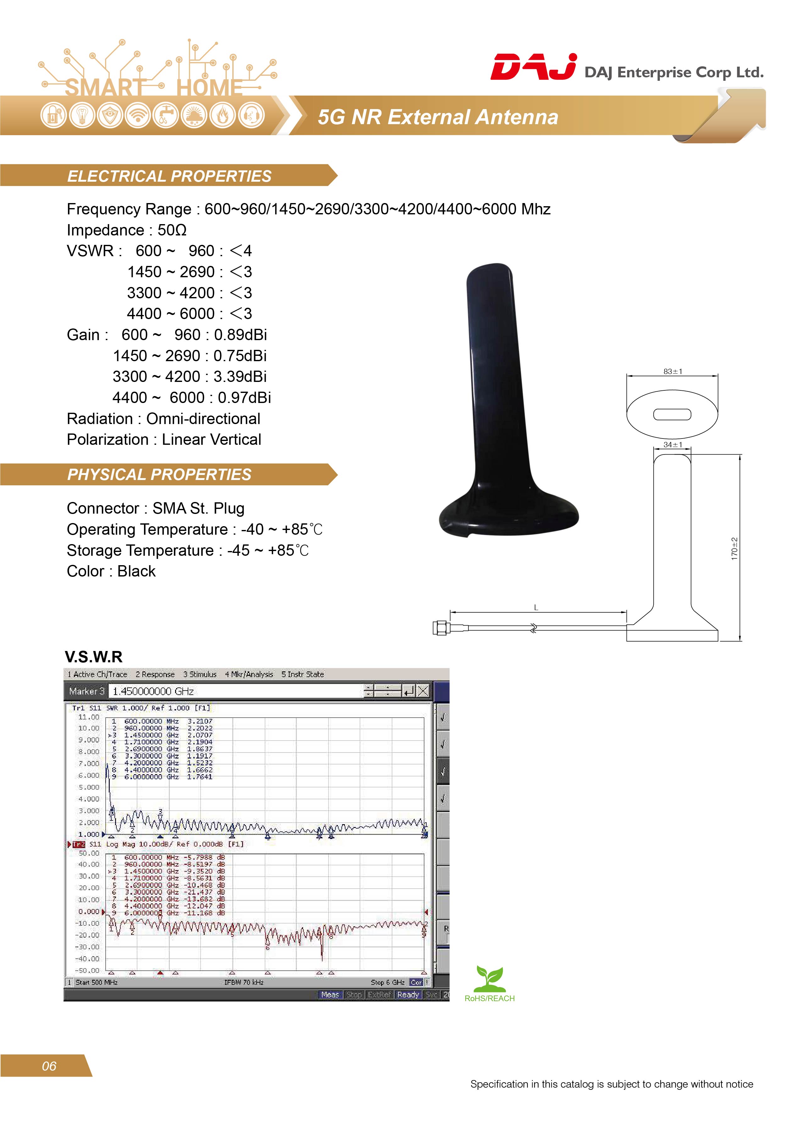 -Frequency range 698–6000 MHz -High efficiency -Termination with SMA-Plug connector -Widely used for wireless applications